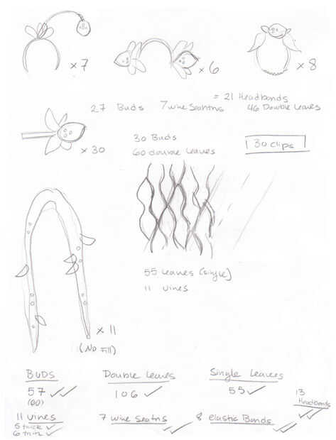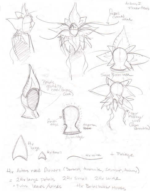 Por la elección de directores, el conjunto de esta producción también aparece para el número final, y se le pidió que se viste de alguna manera también para demostrar la adquisición de Audrey. No quiero competir con las más grandes cabezas de flores, pero dado que brevemente Veamos algunos brotes pequeños de Audrey II antes de este punto, fui con un diseño en que brotes podrían sujetarse al vestuario del actor, así como darles las vendas y las vides que cuelgue en sí mismos. Todos estos coinciden con los brotes pequeños, y debido al número de conjunto en el momento del casting, hay suficientes elementos de un conjunto de 21.
