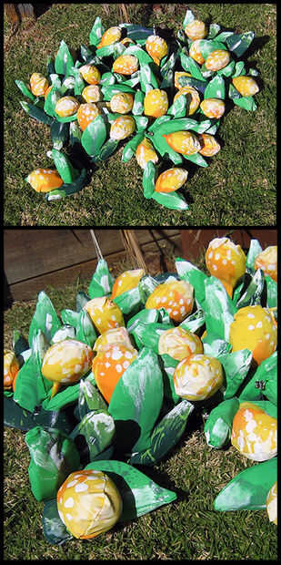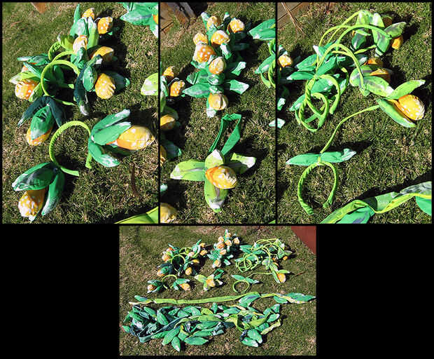 Un poco antes de esto, vemos Audrey ha floreció, y estos brotes han sido recortados para venderse. Para mantener el estilo consistente a lo largo de la feria, hice un conjunto de seis brotes de Audrey II trasplantados a aparecer en el escenario.