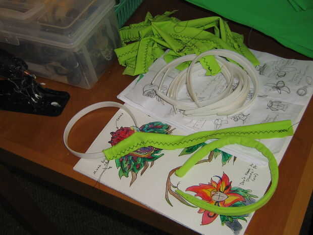 Terminé haciendo tres estilos de diademas, un tipo con una varilla metálica para colgar un capullo por encima de la cabeza del actor, un tipo con dos brotes a los lados de la cabeza al igual que las orejeras y una venda suave tipo con un solo brote en el centro de la parte superior de la cabeza.