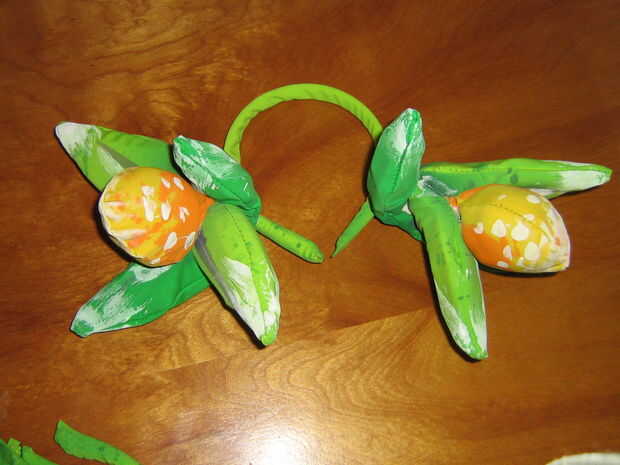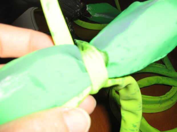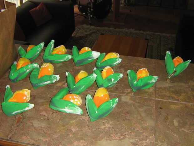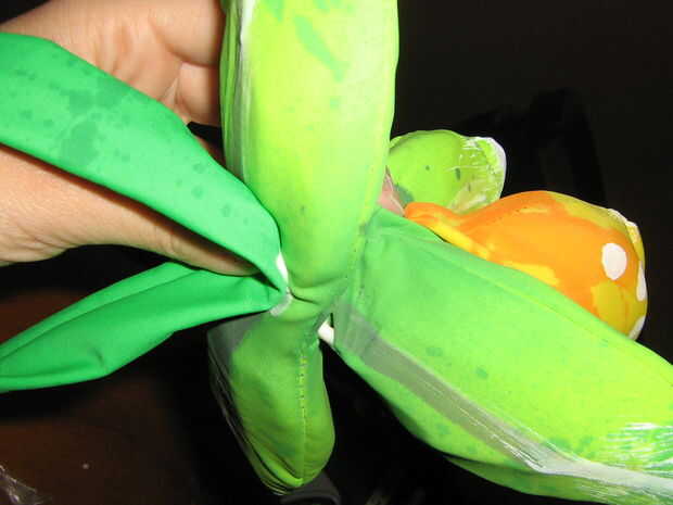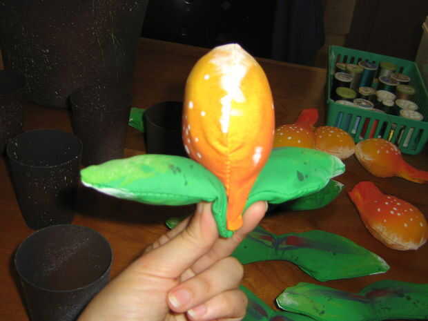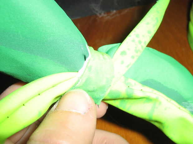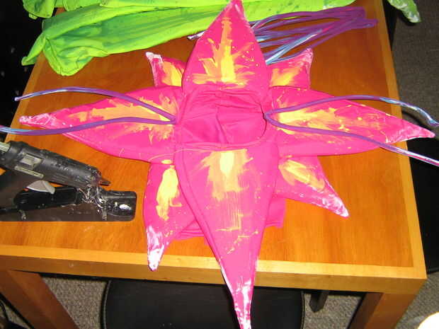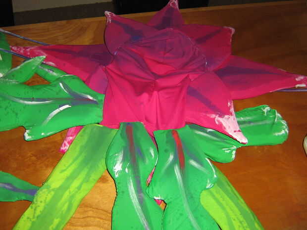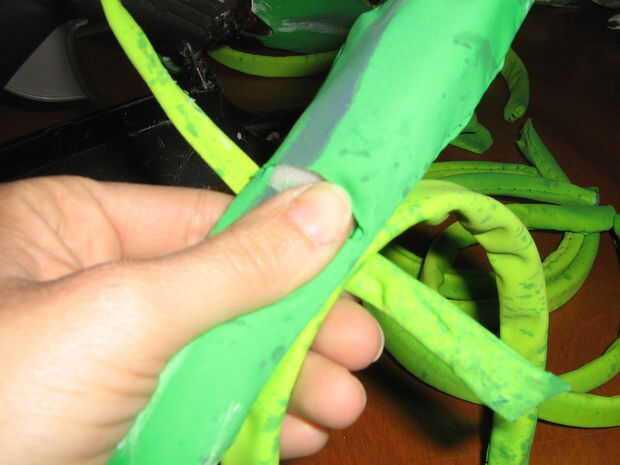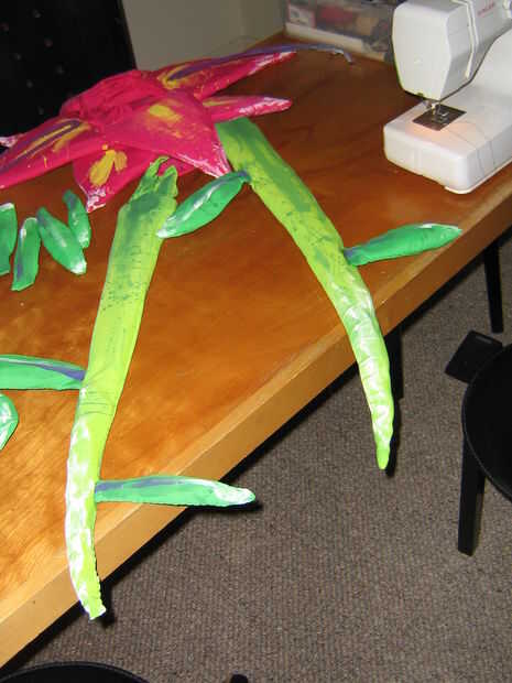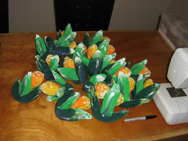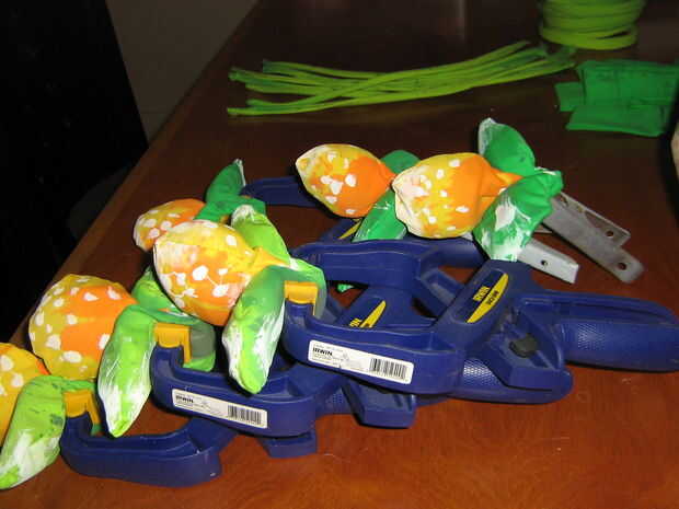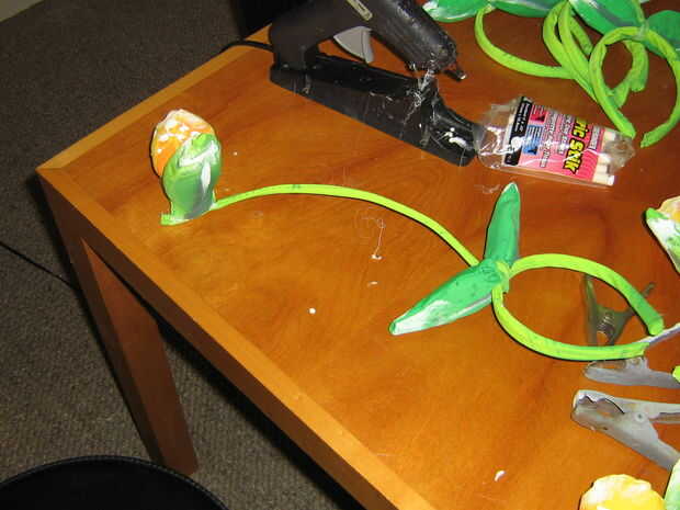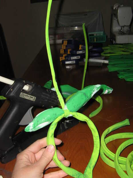 Cada una de estas diferentes piezas requieren montaje final un poco diferente, pero el principio es el mismo para todos. Usando la tela caliente del derretimiento, hojas se agregan a los cogollos, las vides y las hojas se añaden a las cabezas de la flor.
