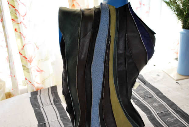 Había cosido todas las piezas en orden, con margen de costura de 1/4" y luego recortar las asignaciones hasta 1/8" 3. Luego lo pongo en el formulario y lo oportuno. Excelente noticia! Las costuras eran un poco desordenado y desigual, pero serán limpiadas y pintadas posteriormente. Grabado en los bordes de las piezas de cuero para el maniquí para ayudarles a mantener su forma y dejarlo reposar un rato.