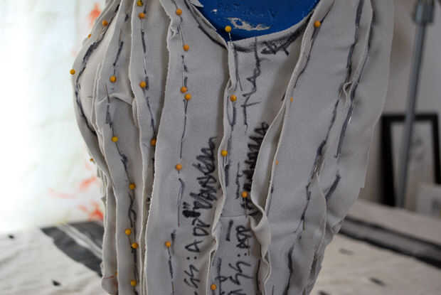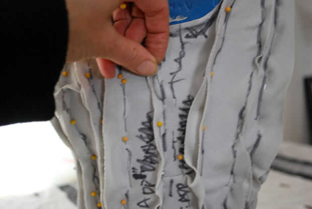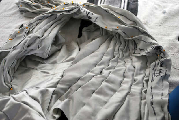 Yo no estaba estirando mi tela mucho como cubrió, pero spandex se estira si quieres hacerlo o no. Es cómo se hace. Por desgracia, la fijación en una forma complicada significa que algunas áreas se extienden diferentemente que otros. Es casi imposible decir cuánto. Así que liberará pequeñas piezas a la vez. Esto dejó las piezas spandex remodelar el cuerpo. Cuando las piezas apartes, que me podrian decir cuánto agregar a cada costura.