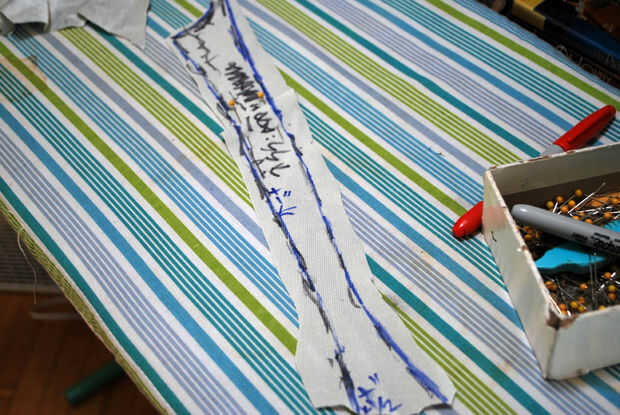 Había marcado nuevas líneas en cada pin, luego liberará el panel lateral de la masa de otras piezas del patrón. He presentado la pieza por separado y había conectado las líneas suavemente con el lápiz azul. También limpia marqué la cantidad a añadir en las áreas donde se corta la tela.