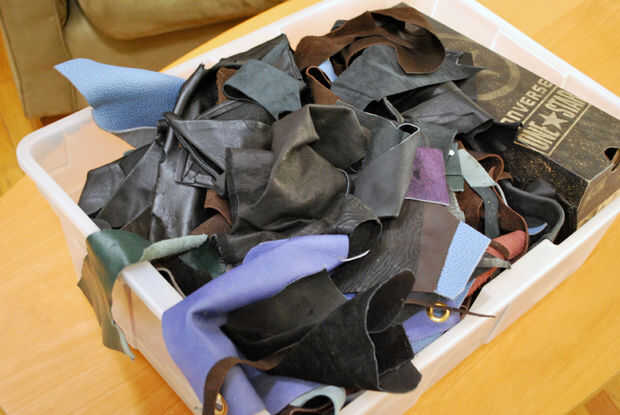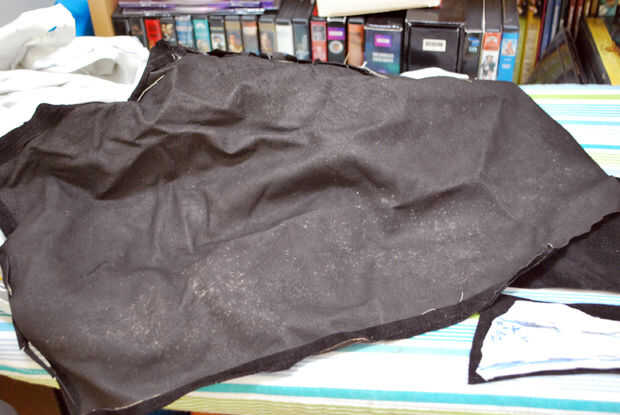 Una vez que la pieza fue dibujada hacia fuera, sacó la bandeja de desecho de cuero muy completo. Utilizo un montón de cuero reciclado. Algunas de ellas vinieron de tienda de ropa de segunda mano (pantalones y chaquetas, sobre todo), pero también ha donado de todos sobre-retazos de la película de Thor, piezas de Tony Swatton de la espada y la piedra, restos de cojines de sofá y un montón de muestras de cuero de tapicería de cuero. Cavado un prometedor pedazo de cuero que una vez fue un par de pantalones de gamuza negra y listo para cortar.