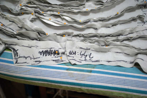 Ante un enorme lío de piezas del patrón, es mejor poner hacia fuera y trabajar con una sola pieza a la vez. Por lo es lo que hice. Me puso el desorden en mi tabla de planchar y echó un vistazo. Empecé con la costura de la parte posterior izquierda. Sólo lo sabía era la costura lateral porque etiquetaron.