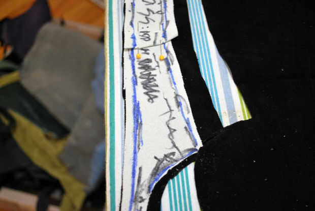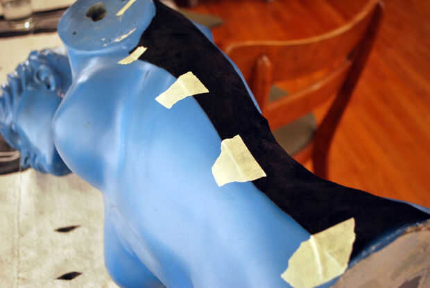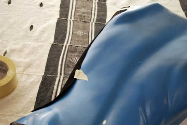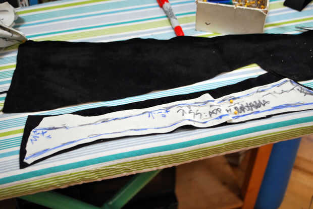 Cuando fue cortada la pieza, puse al maniquí en la mesa de trabajo, lado izquierdo y coloca la pieza de gamuza sobre su lado. He utilizado arrancado trozos de cinta adhesiva para fijar el cuero en el formulario. De esta manera pude comprobar el ajuste de la piel antes de pasar a mi próxima pieza.