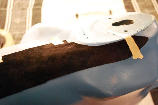 Cinta adhesiva funcionó bastante bien, pero la próxima vez sería utilizar algo menos pegajosa como cinta de pintor. El adhesivo de la cinta demasiado firmemente pegada a la piel. No era un problema con la gamuza, pero en pieles finas, lisas la cinta arrancó el acabado. Más sobre eso más tarde!