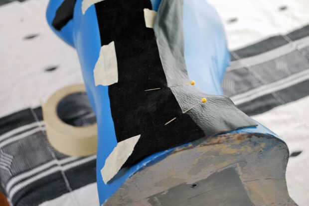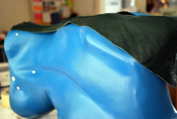 Después de coser la costura, yo por mi margen de costura a 1/8" y el colocar ambas piezas en el maniquí. Había grabado por el ante y me mantiene la piel en su lugar. El ajuste era bastante bueno alrededor del agujero del brazo y la parte superior del hombro, pero estallaron hacia fuera un poco sobre el omóplato. No se preocupe. El plan era usar un cuero un poco más pesado para la pieza siguiente. Pude cinta cuero más pesado hacia abajo, con seguridad.