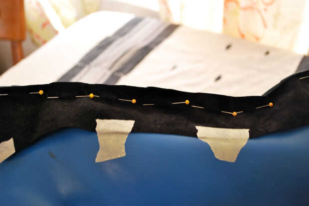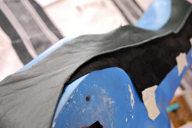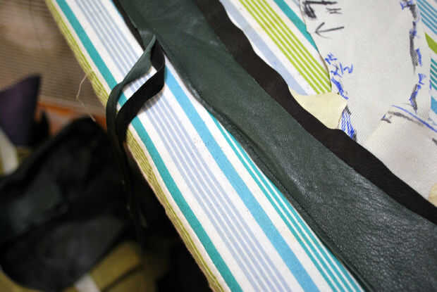 Al principio, traté de superponer mis costuras. Eso significaba tomar el ante, colocándola sobre el cuero verde y fijación hacia abajo. No ir sin problemas. El cuero es difícil de pin. Las grapas son una buena opción para la celebración de una sola pieza de cuero a otro, pero muestran los agujeros de grapa. Los agujeros de perno están un poco más pequeños, pero todavía la cicatriz del cuero. Y la piel verde no jugó bien con la cinta adhesiva. Probé con cinta hacia abajo y la cinta arrancó trozos de acabado liso.