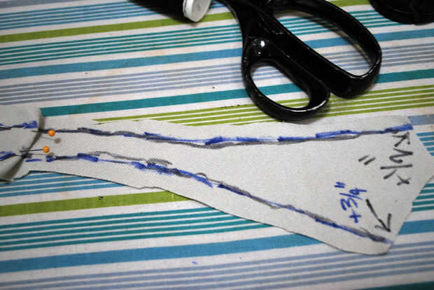 Limpió la siguiente pieza de patrón al igual que hice el pasado 2, usando el lápiz azul para marcar mis nuevas líneas y sacar las clavijas cuando fui. Limpió mis líneas, dibujaba en el margen de costura de 3/8" y hacen notas sobre donde a insertar sobre el patrón. Entonces sacó mi siguiente remanente de cuero, un chocolate oscuro marrón pieza izquierda encima de un sofá.