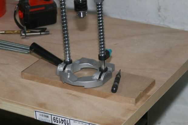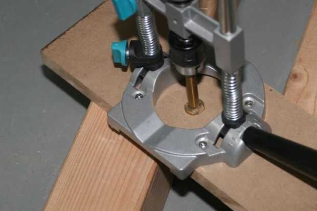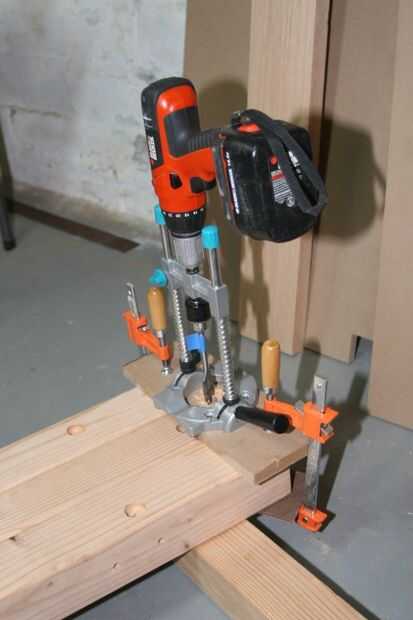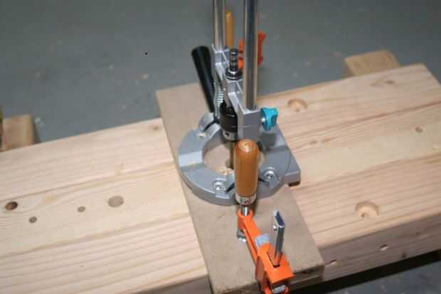 Perforación precisamente posicionada, agujero profundo, amplia no es fácil, sin una prensa del taladro. Así que compré a una guía de taladro WolfCraft. Después de experimentar con él y algunos agujeros de prueba, construyo una plantilla alrededor de él. Había atornillado a un trozo de MDF y luego perforó un agujero centrado con cuidado 3/4". El MDF se puede fijar más fácilmente que la base de sí mismo, y mantener el orificio de 3/4" 3/4" Forstner broca perforar exactamente donde se supone que.