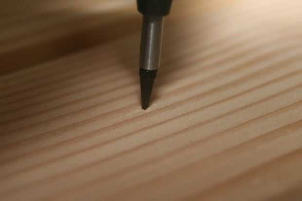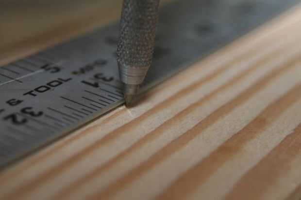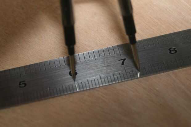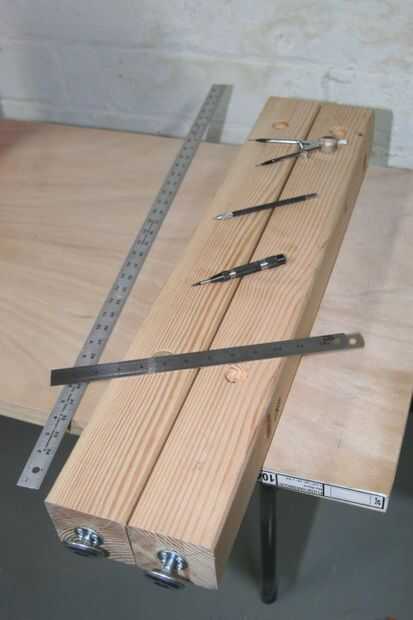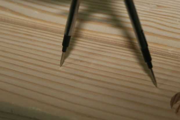 Para marcar la línea central, establecer una brújula para abarcar algo más de la mitad del ancho de la pierna. Dibujar un arco desde la esquina de la pata. El punto de intersección de los arcos estará en la línea central. Con un punto de la línea central en cada extremo de la pierna, coloque un escribano sobre el punto, deslice una regla recta hasta tocar el escriba. Lo mismo en el otro extremo. Cuando tienes la regla que se coloca de modo que se pueden tocar dos puntos con el escriba, y en cada caso es tocar la regla - sin mover la regla - Trace la línea. Uso de escribas, en lugar de lápices o plumas, porque hacen que las marcas más precisas.