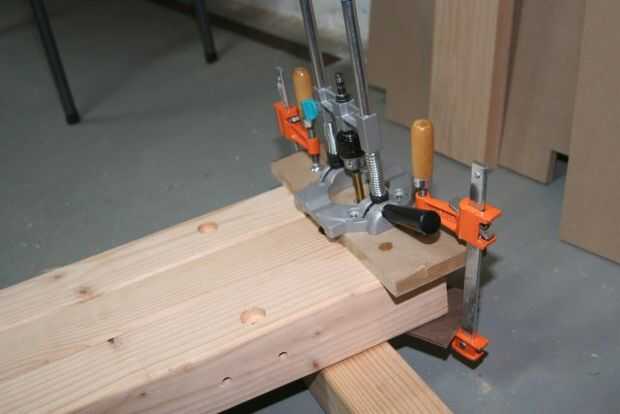 El video de "Que comenzó en la carpintería" demostró solamente un agujero, perforado en la pata delantera derecha, nivel con el tornillo de banco. Esto es útil sólo para una reducida gama de tableros. Decidí perforar en cuatro alturas diferentes en cada una de las patas delanteras, seis pulgadas aparte.