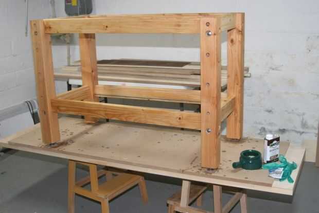 Hice una mesa baja de un par de taburetes de paso, mi puerta de núcleo hueco y uno de los paneles MDF que eventualmente formarían parte de mi top. Me preocupaba que cualquier aceite que gotee en la puerta podría interferir con la adherencia de pegamento, cuando finalmente llego a el proyecto para el que había comprado. La parte superior de la lámina superior del MDF, sin embargo, planeé al aceite, de todos modos. (Ídem para la parte inferior de la hoja inferior.