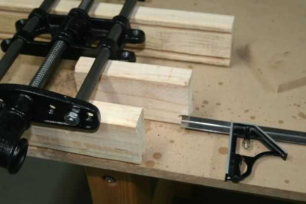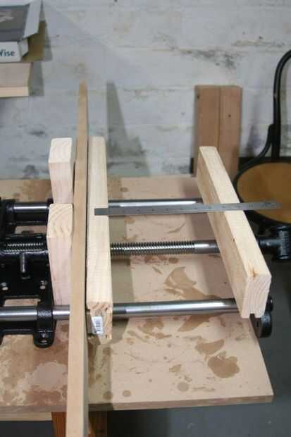 Quería que el borde izquierdo de la mandíbula de la mordaza delantera para quedar al ras con el borde izquierdo de la parte superior, el borde derecho con el borde izquierdo de la pata delantera izquierda. Por lo que la cantidad de saliente de la izquierda depende el ancho de la mordaza frontal. La anchura de la mandíbula es, como mínimo, el ancho de la placa que soporta, pero es normal para hacer que la mandíbula se extienden un poco más allá de la placa. ¿A qué distancia? Cuanto más se extiende, el más profundo una mordedura se puede tomar con el borde de la mordaza, cuando, por ejemplo, se afianza con abrazadera al lado de una junta se llevó a cabo verticalmente. Pero cuanto más se extiende, la menos apoyo tiene. He decidido extender por 1-12", que me da un bocado de 2-1/2", y que todavía debe dar sólido apoyan, dado que la mandíbula es 1-1/2" de grosor. Esto significa que la parte superior necesita un alero izquierdo de 12-1/4".