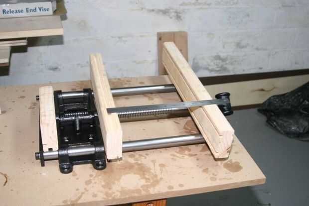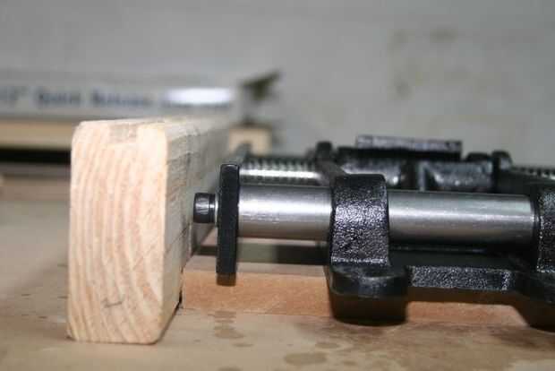 La decisión con respecto a la mordaza final es si la placa de apoyo debe montarse en el interior o en el exterior de la camilla. La placa de montaje en el interior de la camilla reduce el alcance de la prensa - no se puede abrir como ahora, porque la placa de apoyo es hacia atrás desde el borde por un par de pulgadas. Pero la placa de montaje en el exterior de la camilla significa que tenemos que añadir una estructura de apoyo para la mandíbula interior de la mordaza, que habría proporcionado las piernas si habíamos montado la placa en el interior.