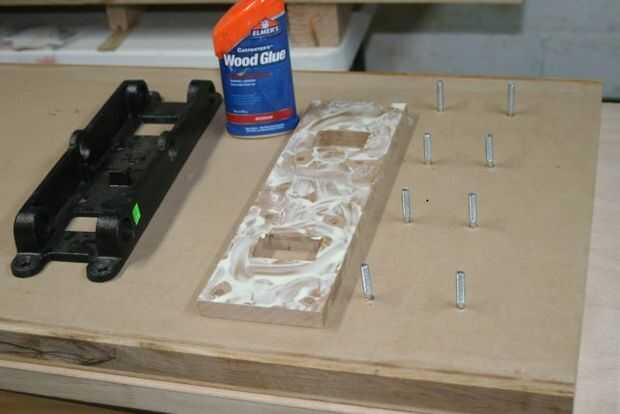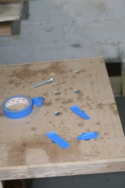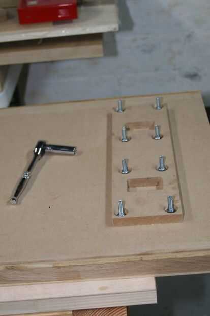 Con los agujeros y buriles en el lugar, inserta los tornillos, utiliza cinta para guardar de caer hacia fuera, girar la parte superior, aplica pegamento a la pieza de soporte de MDF, caber sobre los tornillos, arandelas añadidas y tuercas y había apretado hacia abajo.