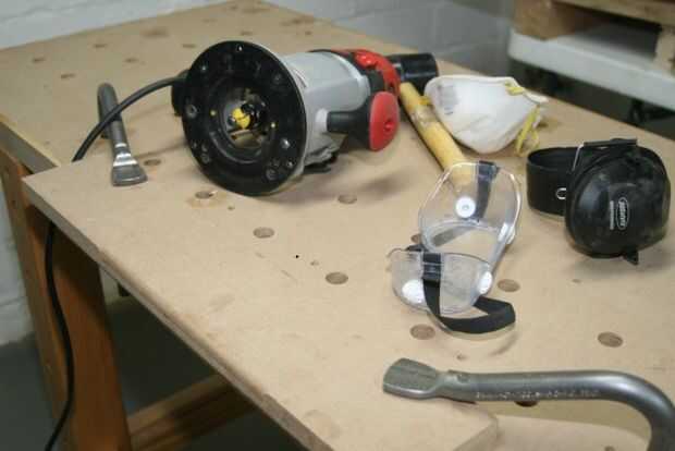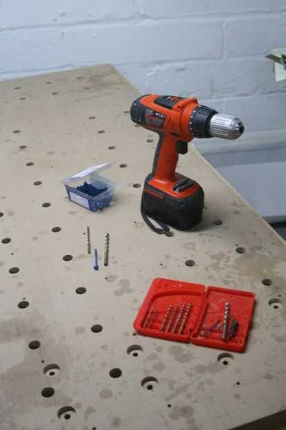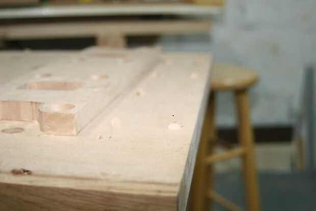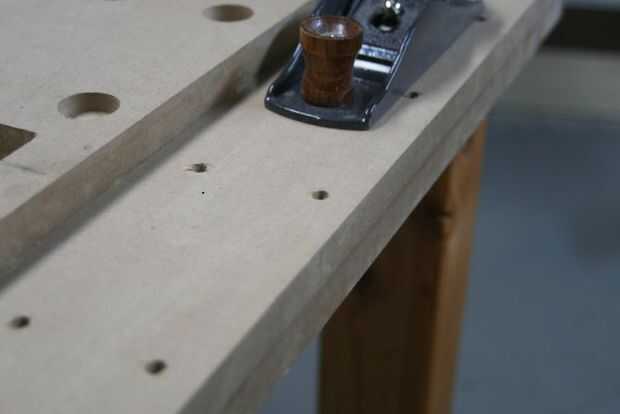 En su mayor parte perforé a través de los orificios existentes de laminar las dos hojas de MDF. En algunos casos me trasladé un agujero un poco porque era demasiado a un agujero de benchdog. Y creé una nueva fila de agujeros alrededor del borde exterior, porque los hoyos originales a lo largo del borde exterior cortaron como hemos recortado el MDF a medida.