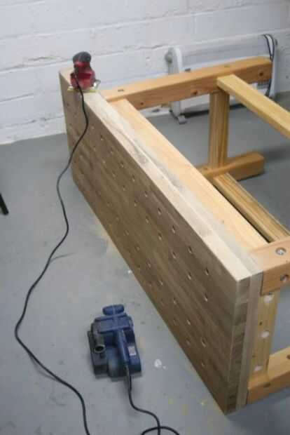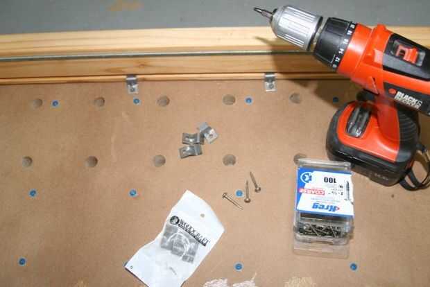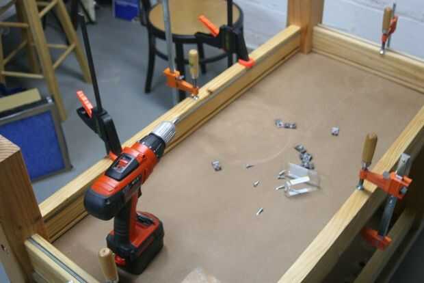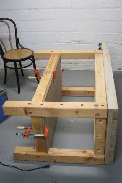 Después de lijar el segundo borde, abrazadera el estante en su lugar, el lado engrasado hacia abajo. Luego dé vuelta el Banco boca abajo nuevamente y coloque el estante en la base con s-clips. (Usted necesitará tornillos de cabeza redonda de 3/4"- los tornillos utilizados en la parte superior será demasiado largo.)