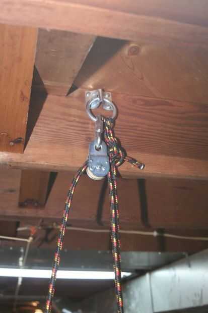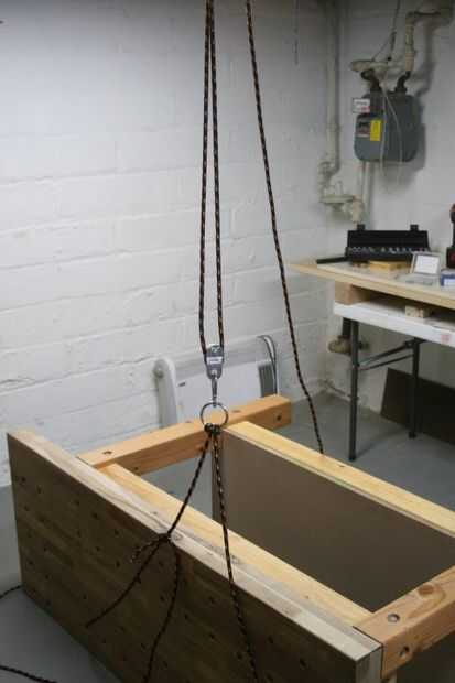Con la plataforma segura, conseguir un par de amigos a venir a ayudar, y soporte el banco bajo sus pies. Dije antes moviendo que la parte superior por sí mismo es peligrosa. Intentar levantar el Banco todo es temerario. Por supuesto, ya dije que soy terco, por lo que hice yo mismo por un simple bloque-y-tackle utilizando poleas ligeras que conseguí en la ferretería del aparejo. (No las poleas peso más ligero, se significan para astas de banderas y tendrá un diseño de algo así como 40 libras. Éstos tenían una carga de diseño de 420 libras).