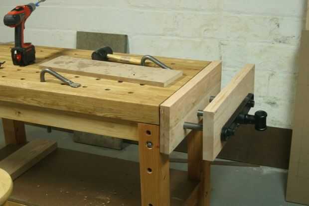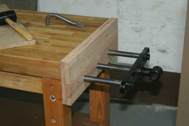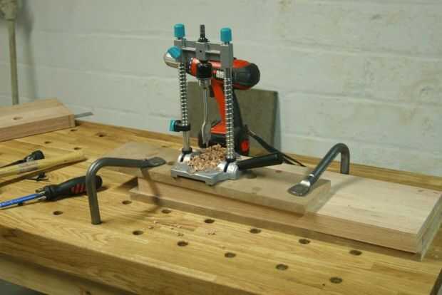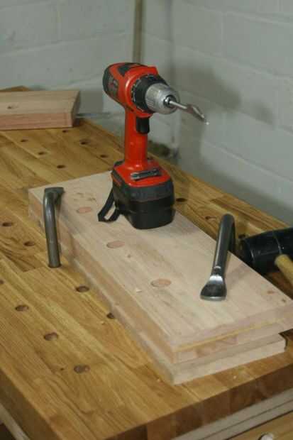 Sujete la mandíbula interior de la mordaza final en posición, dejando un poco a recortar más tarde y luego usar la espiga y la espiga centro truco a través de los orificios de la barra tornillo y guiide de la placa base de tornillo de banco para marcar la posición de los agujeros de la barra guía y tornillo de la quijada. Retire la mandíbula y 1-1/8" perforar en las posiciones marcadas. Utiliza a la guía de taladro para la mayoría de los agujeros y perforados a mano alzada para la última parte. Cuando usted comienza una broca de pala en un hoyo profundo como esto, iniciar el ejercicio muy lentamente, y la broca mueva el taladro en una posición perpendicular. Inicio que muy rápido y la broca se unirán y a dañar los lados del agujero.