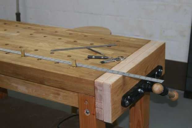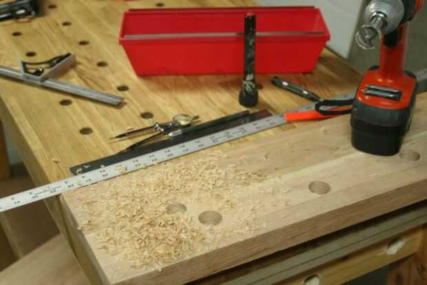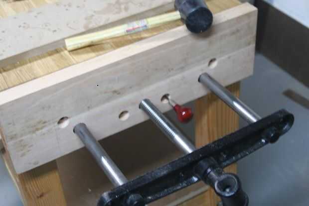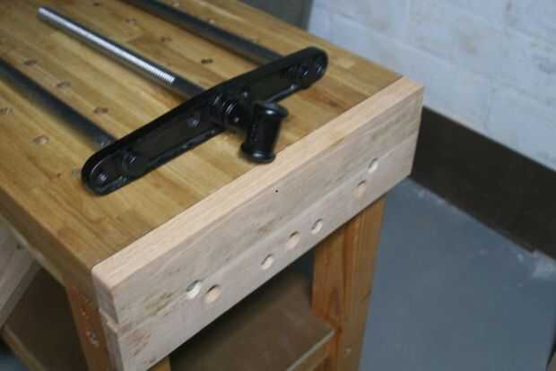 Montar los tornillos, para el tiempo final. Usted podrá no ser tomarlos apagado otra vez, así todo apriete y coloque la tapa en los extremos de las barras del tornillo y la guía. Luego marque y taladre los agujeros benchdog en el inline de mordazas exterior con los agujeros benchdog en la parte superior. En general, a través de los agujeros se prefieren para benchdogs, para que no recojan polvo y mugre. Con estas prensas, que no es posible, hay tornillos y barras de la forma. Los sólo lo suficientemente profunda como para mantener un banco de Veritas del potro (su benchdog de reducción de altura), sin ella se hunde a donde no puedo conseguir un agarre para sacarlo taladré. Rockler vende algunos benchdogs plástico muy económico que no puede ser ajustado para la altura y no son tan fuertes como los perros de metal o de madera, que pretendo mantener en los agujeros a tiempo completo, para mantener el serrín de recoger en ellos.