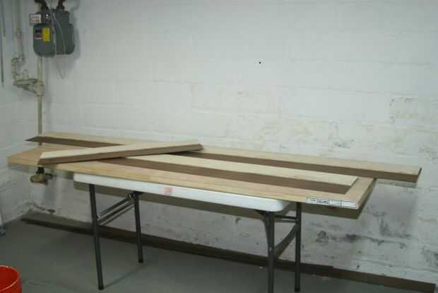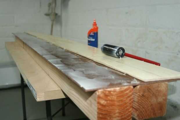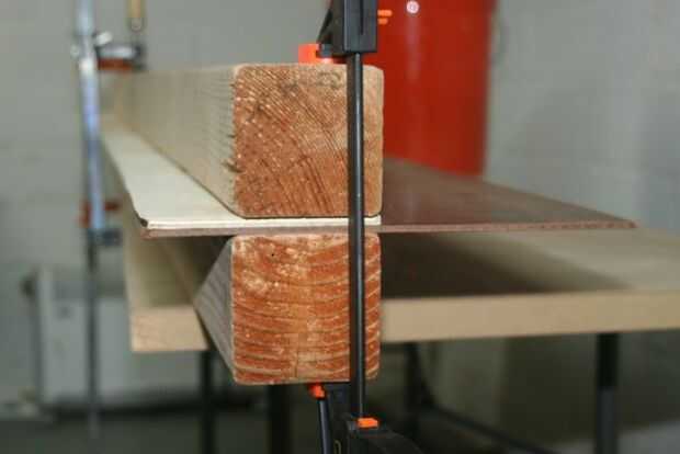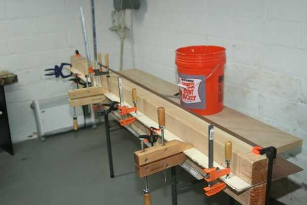 Este tipo de cosas es generalmente pegado y atornillado, pero es realmente el pegamento que mantiene juntos - los tornillos sólo mantenga todo apretado mientras el pegamento seca. Atornillar en madera prensada o 1/4 ply es un ejercicio inútil, así que sólo utilizar pegamento y utilizar mis dos 4 x 4 como pinzas largas. Hubiera sido un poco más fácil, si había hecho esto antes de que tuve rough-cut el 4 x 4, pero funcionó.