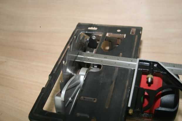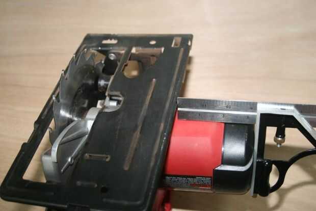 La base debe ser tan amplia como la suma de la anchura de la tira de guía y la distancia desde el borde del zapato, más un poco extra, con mi sierra, la proyección de 3-1/2", así que hice mi guía tira 5-1/2" ancho. La distancia entre el borde de la zapata a la hoja es de 4-1/2", por lo que la base debe ser al menos 10" de ancho. Ya que estaba trabajando con una hoja amplia de 24", yo sólo en rodajas lo por la mitad.