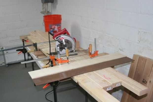 No hay ninguna necesidad real para hacer estos áspero cortes con la guía de corte en los 4 x 4 con abrazadera juntos, pero lo hice de todos modos, sólo para la práctica. Esto reveló que con mi primer intento de guia de borde, las pinzas podrían obtener en el camino de la sierra motores, al hacer un corte profundo.