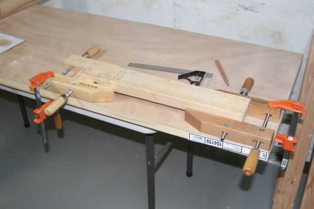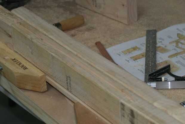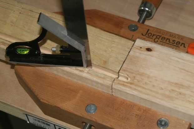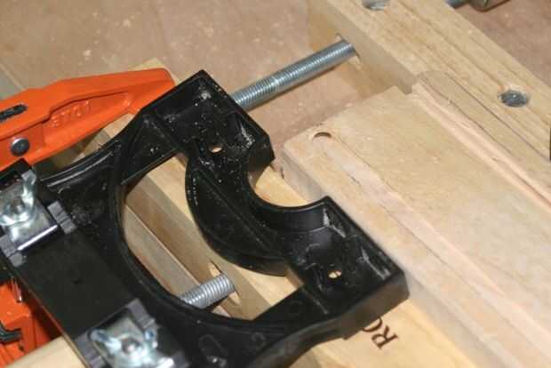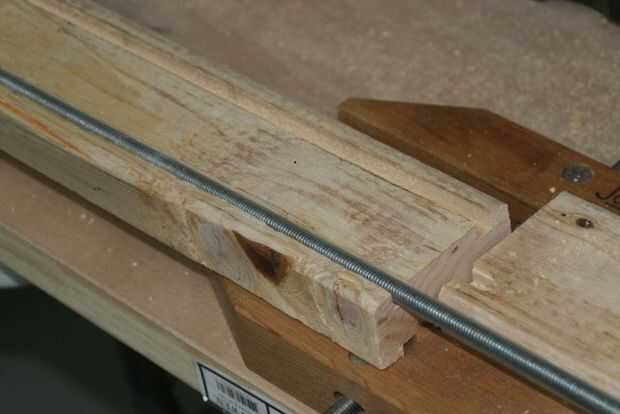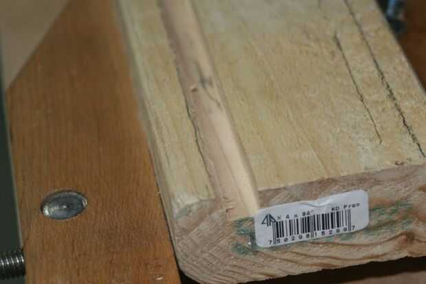 Terminé haciendo una serie de cortes de práctica. El primero reveló que yo no había apretado los tornillos de la guía de borde bastante. La segunda reveló que el diseño de la guía de borde proporcionado muy poco apoyo en el extremo de una tabla, debido al cut-out para la broca de fresadora. En el video de "Que comenzó en la carpintería", había jodido un pedazo de madera a la guía de borde, para proporcionar una superficie de rodamiento continua--y más. Puedo hacer eso yo, algún día, pero no tengo los materiales a mano, así que sujeta algunos desechos de 2 x 4 para el extremo de cada tabla, para proporcionar una superficie de rodamiento continua más allá de los extremos. Las dos ranuras en los soportes separadores largos y la ranura lateral en los extensores cortos tienen idéntico diseño. Hice cortes de práctica en chatarra hasta que tuve la guía de borde definida correctamente, entonces yo cortar con eso un ajuste. La ranura de la parte inferior de los extensores cortos utiliza una configuración diferente, por lo que fue a la chatarra, antes de cortarlos.
