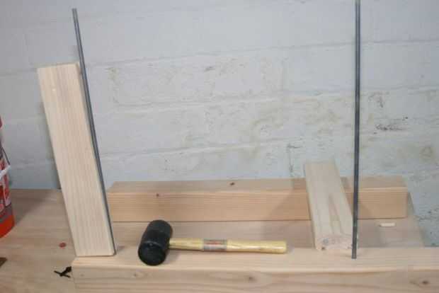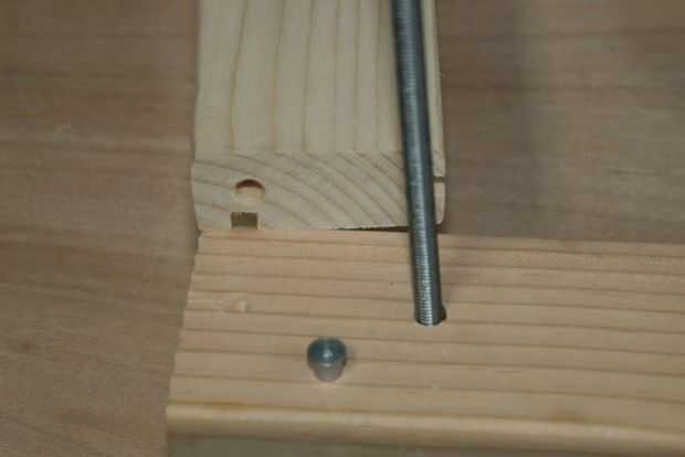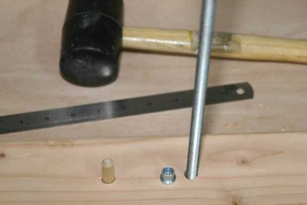 Establecer una pierna sobre la superficie de trabajo, con el lado avellanado de los agujeros a través de. Pegar un trozo de varilla roscada en cada agujero. Tomar una camilla que se marca para tener un extremo adjunto la parte superior de este tramo, pegar un centro espiga agujero de pasador, línea contra la pierna, utilizando la varilla roscada para la colocación, desea que la parte superior de la camilla que incluso con la parte superior de la pierna, o un poco por encima. Dar el final de la camilla un golpe con su mazo de goma. Esto dejará una marca que indica que necesita taladrarse el correspondiente agujero de pasador en la pierna. Repita con la camilla baja que colinda con este pata. Luego repita con la otra pierna que formará este caballete y los otros extremos de los dos tirantes.