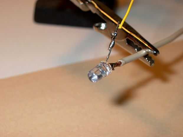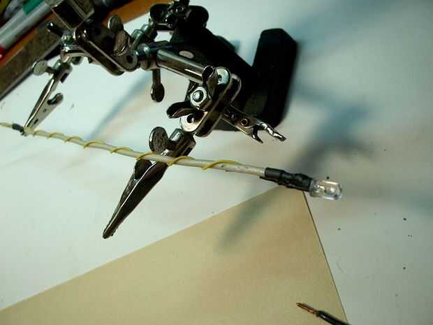 Los LED están montados en el extremo de un pedazo de alambre de cobre maleable por lo que se puede mover a diferentes alturas y ángulos para diferentes efectos de luz y sonido.
