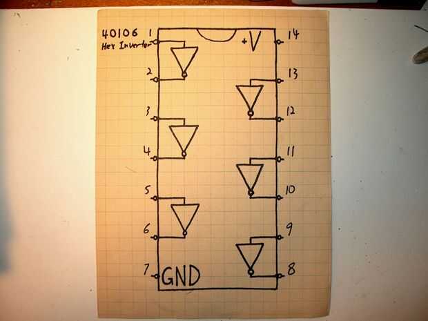 Lo primero es soldar el 40106 a un circuito impreso con cables de color codificado sobre 6-8" largo. Para ello rápidamente como el 40106 es un poco sensible al exceso de calor y pueden ser dañados si se recalienta. Si eres nuevo en edificio de circuito usa un zócalo del IC 14 pin de Radio Shack. Esto le permite soldar un zócalo en lugar de la viruta y a conectarlo después para evitar calor o daño estático. Ya que tengo un montón de la alambre I utiliza un color diferente para cada pin en el lado izquierdo del chip y repetido en el lado derecho como sigue-