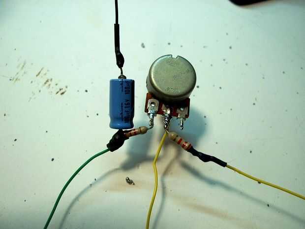 Ahora veamos los dibujos del circuito anteriores. Uno es un esquema básico del circuito y el otro es un diagrama de cómo conecté el circuito en mi proyecto. Este circuito debe repetirse para los pernos 1 y 2, 3 y 4 y 5 y 6. Esto es sólo un ejemplo-no dude en adaptar el diseño sin embargo le parezca. Personalmente creo que este diseño de circuito de control-lado un poco más rápido para trabajar con cosas simples como esta y que hace mucho más fácil ver cómo engancha. Esto de la soldadura hacia arriba y probarlo. Conecte el rojo y negro conduce a un pan del tablero y conectarse un clip de batería de las mismas filas. Conecte el cable del condensador de 100uf a la toma de tierra. Enchufe el cable de LED de la olla a una fila libre de la placa y conecte el cable positivo desde el tallo de LED en la misma fila. Conecte la batería en el clip y toque con el conductor negativo grueso desde el tallo del LED a tierra. Si el LED parpadea y cambia de velocidad cuando girar la olla Felicidades-it obras si no vuelva a verificar las conexiones, asegurarse que no haya cortocircuitos o puentes de soldadura, toma una respiración profunda y siga intentándolo hasta que funciona. Eventualmente lo hará.