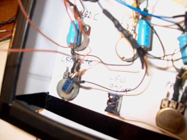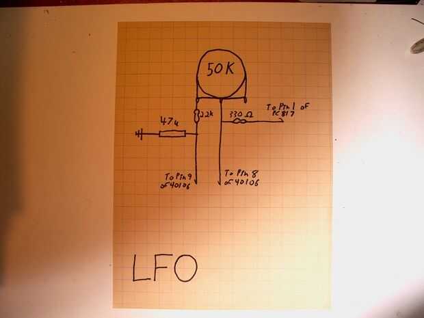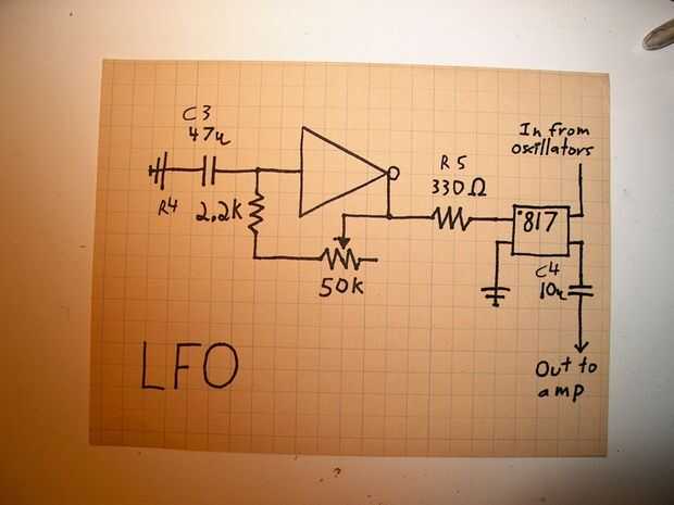Conecte el circuito como se sugiere en el diagrama de arriba. Monte el PC817 en el mismo circuito como la CD40107 y la soldadura en algunos cables de 5-6", conectar el pin 1 a la salida del circuito del LFO, pin 2 a tierra. Conecte la salida de los dos osciladores de audio con conector de 4. El cable en el pin 3 se conectará a la etapa de salida en el paso siguiente.