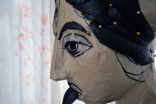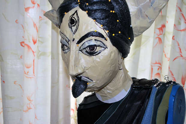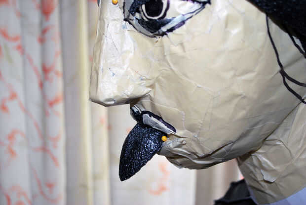 He encontrado algunas rocas de terrario de vidrio para usar debajo del centro del ojo. Eran formas ovaladas cúpula irregular con respaldos planos y encajan perfectamente en los zócalos del ojo. Graba los debajo del iris y la pupila de cada ojo. Utiliza algunos más barra de espuma para hacer formas de párpado y pegar con cinta adhesiva los y luego fijó los ojos en su lugar. Mucho mejor!