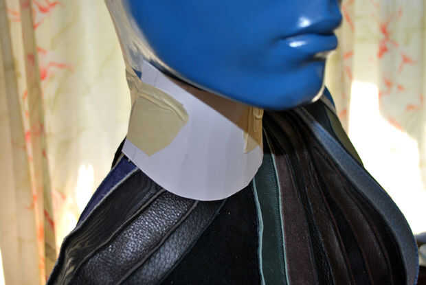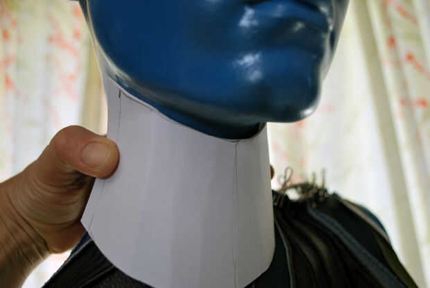Una vez que la pieza fue cortar, doblé pliegues sobre cada 1" así que curva muy bien alrededor del cuello. Luego sostuve la pieza hasta el cuello del maniquí. El lado izquierdo era un poco demasiado alto, así que ajustar y volver a cortarlo. Hizo el truco. Pegadas a ambos lados de la Junta sobre el cuello delantero y nos dispusimos a trabajar en la parte posterior.