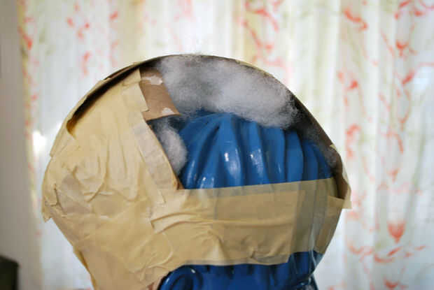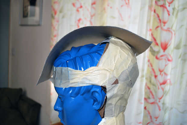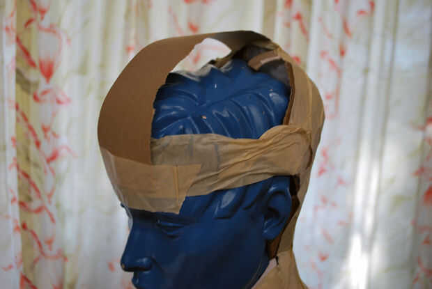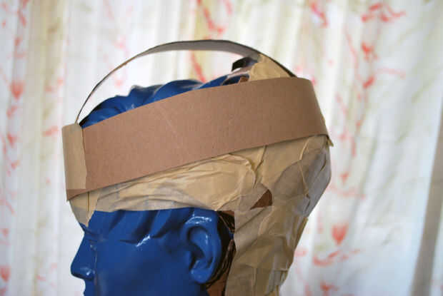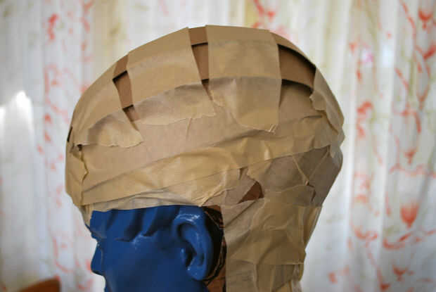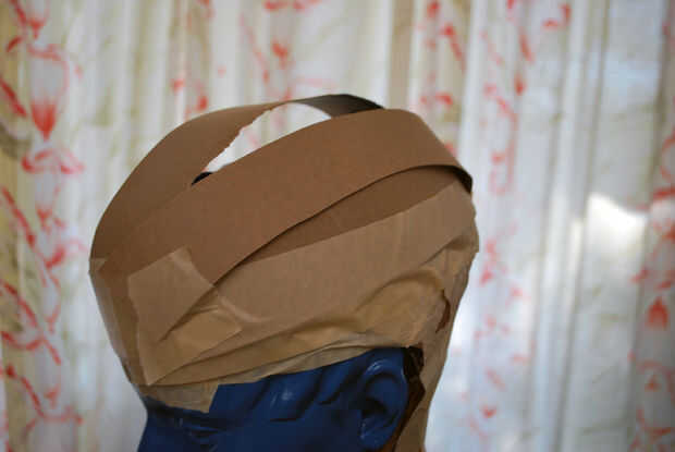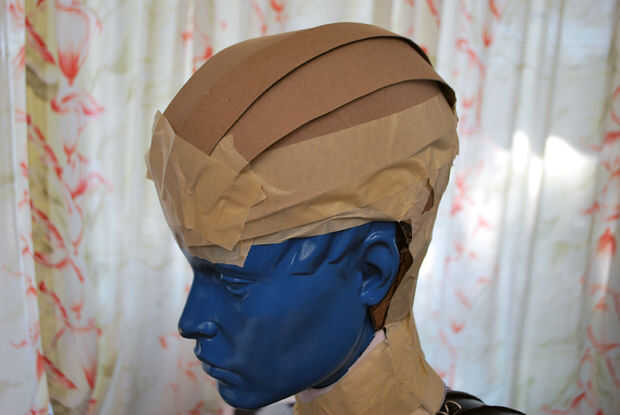I con cinta una tira al frente de la maniquí, hace un arco sobre su cabeza y con cinta el otro lado hasta la parte posterior de su cráneo. Entonces agregué otra tira alrededor del lado. Comenzando desde la izquierda hasta la parte superior, yo seguí grabando tiras de cartulina hasta que me dieron una forma aproximada de la cabeza. Grabó las tiras juntos libremente, empujó flojo bateo para llenar en el área del lado y echó un vistazo en el perfil. Fue una muy buena forma, pero las tiras de cartón hicieron la cabeza como armadura segmentada. No precisamente el efecto que después.