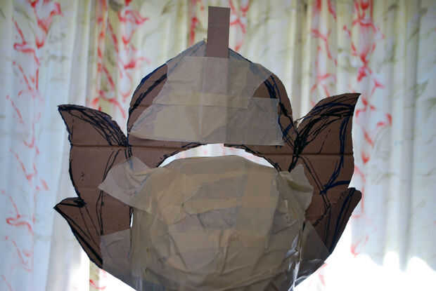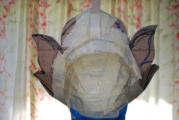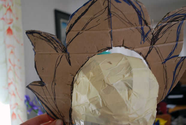 Por desgracia, eso hizo la tiara demasiado corta y estrecha. Me corte la tiara por la mitad, extender las piezas aparte unos 3/4" y libremente con cinta las piezas de la cabeza. Llena el vacío del centro con cartón de desecho y pegadas en su lugar y luego llena el vacío en la base de cartón más. Alisar las juntas con cinta adhesiva y me paso atrás para tomar otra mirada.