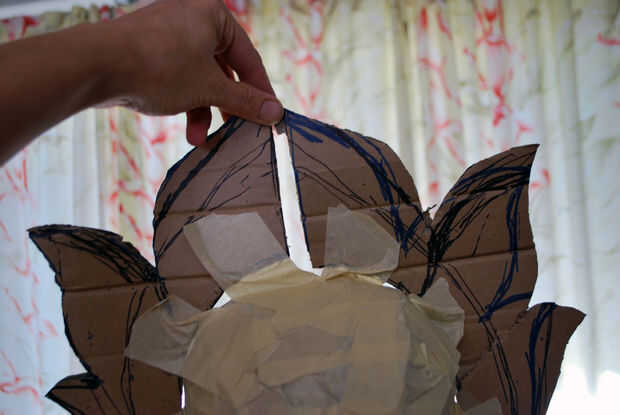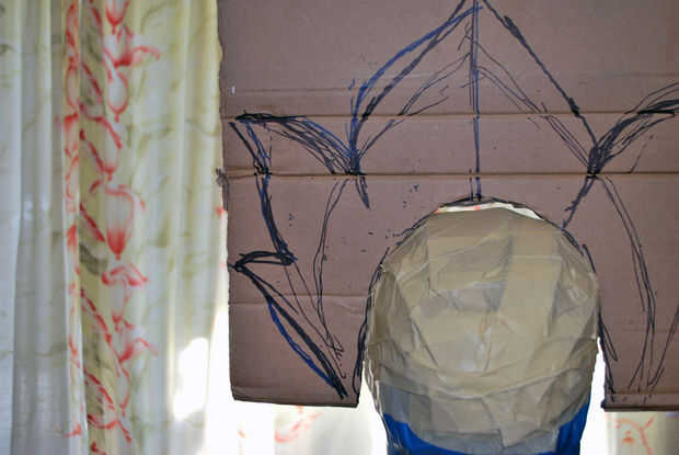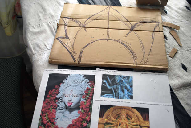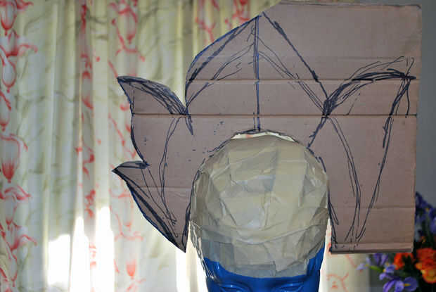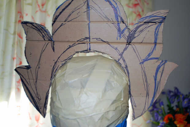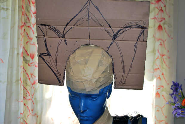 Utilizando la investigación como una guía bosquejó una forma áspera en un pedazo de cartón. Ninguna de las imágenes de la investigación de acuerdo sobre la forma de su tiara, así que falsificó. Se me ocurrió algo que parecía un cruce entre una flor de loto, un tocado ceremonial ruso y una mezcla de mi investigación. Dibujaba en un semicírculo en la base, corte y poner la cartulina en la parte superior nueva cabeza de maniquí.