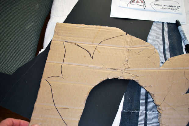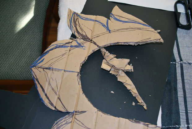 El corte no encajaba bien, pero consiguió la corona en posición. Refinado la forma en la forma, volver a dibujar los puntos superior y ajuste de las curvas. Corte el lado izquierdo y había marcada la silueta. Veía bien, así que el cartón del maniquí, dobla la pieza por la mitad y trazada alrededor de la izquierda para crear una juego lateral derecho. Después de cortar eso, he probado el ajuste otra vez. Dibujaba a la abertura principal de medio círculo y volver a cortarlo para que la tiara sentaría más abajo en la cabeza.