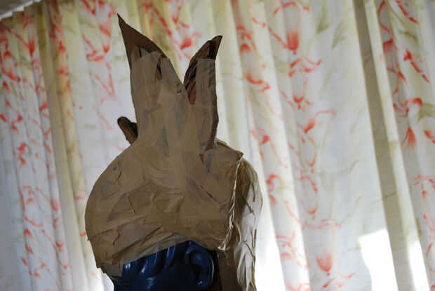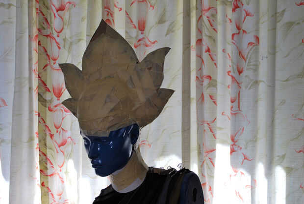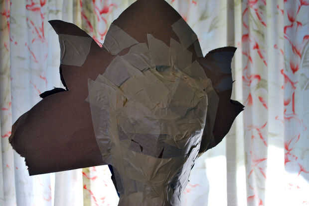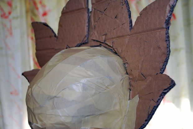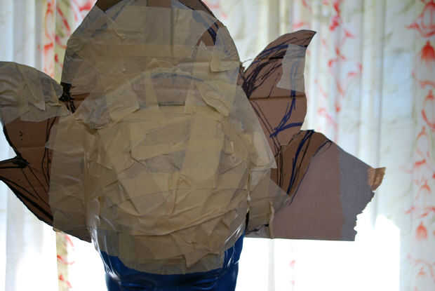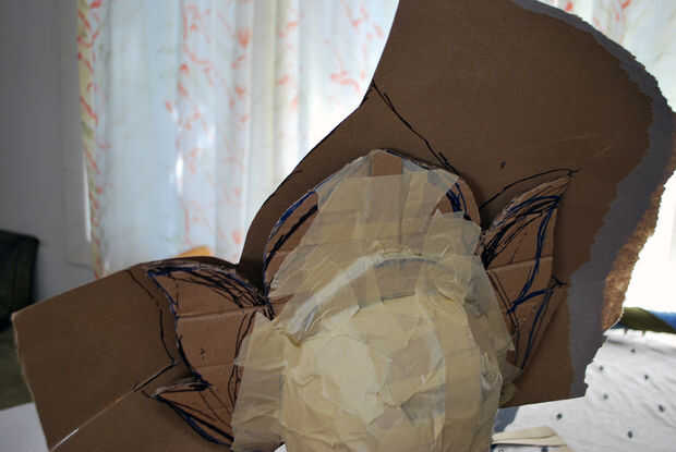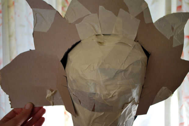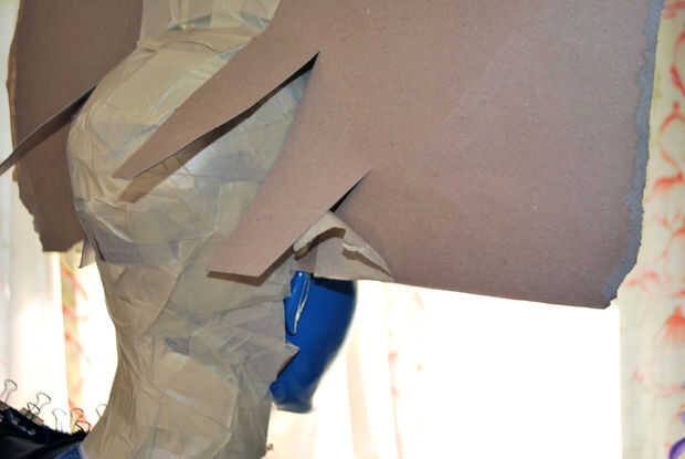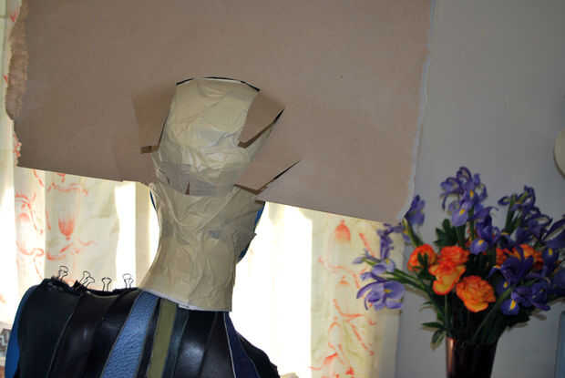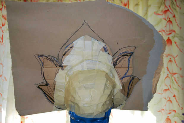 Vuelta al maniquí para comprobar hacia fuera la parte posterior de la tiara. Quería añadir más dimensión y altura. La forma más sencilla de hacer que era añadir un soporte de cartón. Me arrancó la parte trasera de un bloc de dibujo grande, cortar algunas cuñas en la base y llevó a cabo la Junta de la parte trasera de la cabeza. Parecía que la haría el truco.