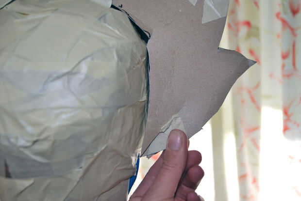 Terminé el recorte de las cuñas y luego graba el respaldo a la cabeza, comenzando en la parte superior y hacia la izquierda. Una vez que la zona era segura, tome otra mirada en el borde inferior derecho. Volver a dibujaba las líneas y cortar el cartón para que ajuste perfectamente al lado de la cabeza. El siguiente paso fue únalos con cinta adhesiva los bordes de la tiara.