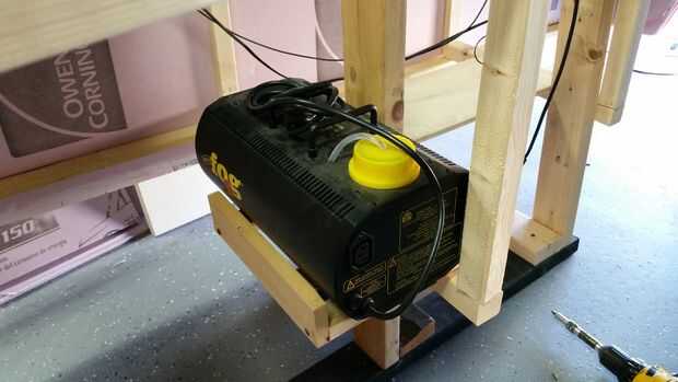 Se ha añadido una tabla en el centro para la electrónica y altavoces y una plataforma que sostendría una máquina de la niebla. Os adjunto también un pedazo de tubo PVC en la parte inferior de la plataforma de fogger para apoyar la llanta de ese lado.