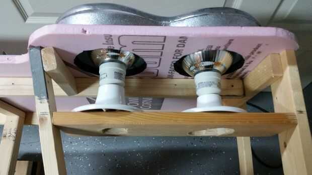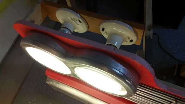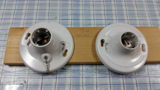 Tuve 4 bases de bombilla básica puesta en el taller que funcione bien, por lo que había montado en pares en pedazos de 1 x 4, que a su vez fueron montados en la estructura detrás de la cara frontal. Necesitaba perforar un agujero de buen tamaño para cada artefacto en la Junta para sus terminales de conexión.