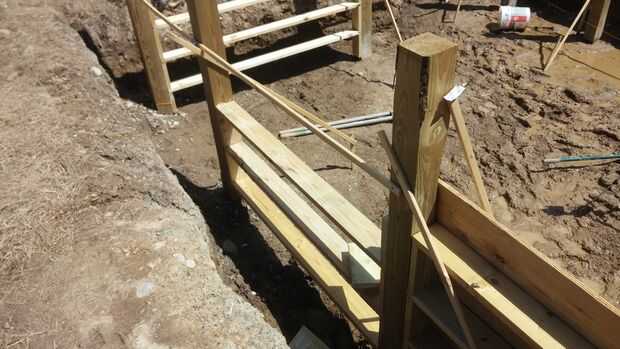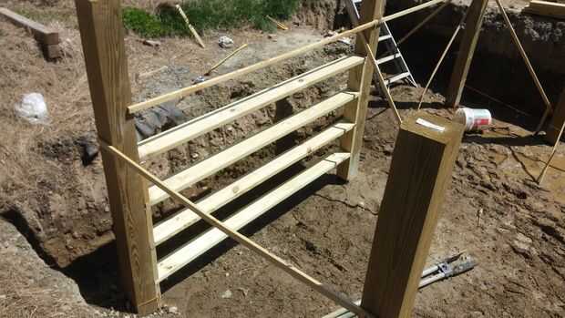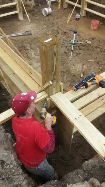 en este paso empezamos a construir las paredes con placas de 2by6. colocamos tres 2by6s 11 1/2 aparte. Esto le dio a nuestras paredes de algún apoyo. luego ponemos en algún bloqueo para mayor apoyo. También hemos añadido algún soporte en la parte posterior con algunas correas 2by4 con un pin de varilla.
