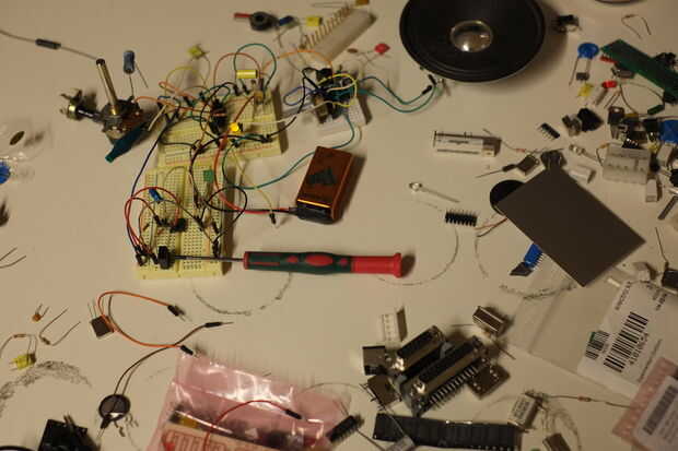 Nuestra creatividad realmente activaron después el último paso para estar trabajando. Uno de los participantes comenzó a reemplazar diferentes piezas en el tablero, sólo funcionó. Pronto todo el mundo empezó a hacer experimentos de arbetory. De esta manera es muy fácil decir qué tipo de frecuencia se corresponde con qué componente. No necesitamos conocer a qué frecuencia es exactamente, para que esto efectivamente prestados el mathmatical formular de frecuencia inútiles. No sé si es un enfoque seguro acaba molestando el circuito, pero el temporizador 555 parece bastante robusto y tolerar, ya que nunca dejó de funcionar o atrapados ardiendo durante la noche.
