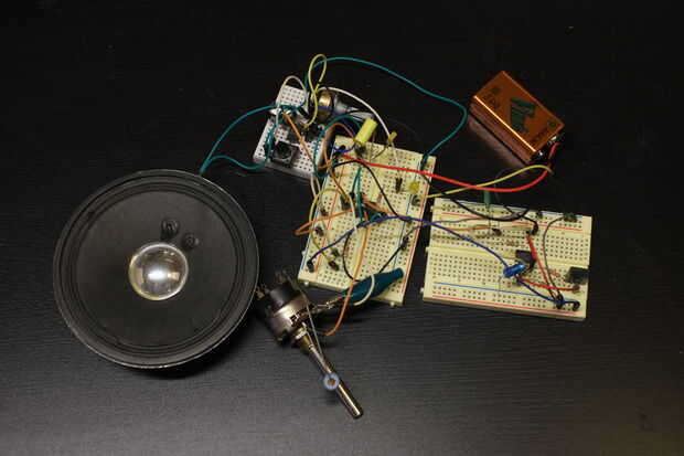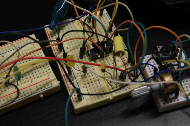 Para el resto del tiempo que hemos logrado acoplamiento temporizadores dos 555 juntos, había añadido en unos potenciómetros, trataron de todos los componentes a mano, incluso apilan unos cuantos juntos o colocaron en lugares equivocados. Sorprendentemente la mayoría de los experimentos agrega cambios y un poco de sabor al sonido que genera, que incluso el más ridículo. Así que al final conseguimos un trabajo sintetizador, que llamamos ruido monstruo. Es muy poco científico y no puedo decir cómo es capaz de generar un patrón de sonido tan extraño, algo definitivamente no puede conseguir de los cálculos.