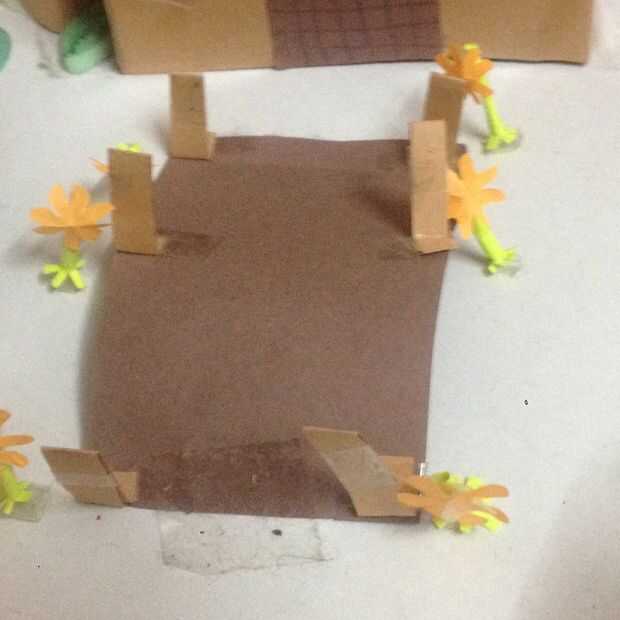 4. Flores: Tomar algunos papeles de colores y cortar algunas formas de la flor y pegarlo sobre la pieza de cartón.