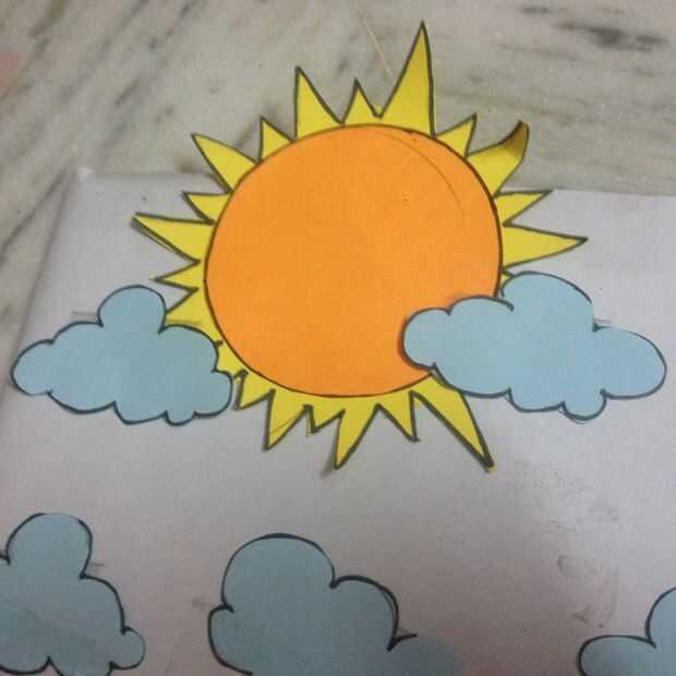 2. el sol y las nubes: Tome algunas hojas de papel naranja, azul y amarillo y recortar las nubes el rayo de sol y el sol